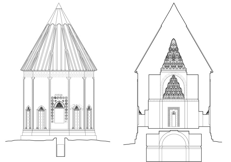 […] Το mihrab και το περιεχόμενο της επιγραφής επιβεβαιώνουν ότι ο «πελάτης» ήταν μουσουλμάνος. Ωστόσο, δεν υπάρχει έλλειψη στοιχείων στην αρχιτεκτονική του μαυσωλείου που μιλούν για συνδέσεις με την αρχιτεκτονική των γειτονικών χριστιανικών περιοχών: τη διακόσμηση της εισόδου, τις λύσεις των στηλών, το χαρακτήρα των σταλακτιτών. Παρατηρούμε ιδιαίτερα τις εικόνες των ζωντανών πλασμάτων, που σπάνια βρίσκονται στη διακόσμηση των μνημείων του Αζερμπαϊτζάν […]